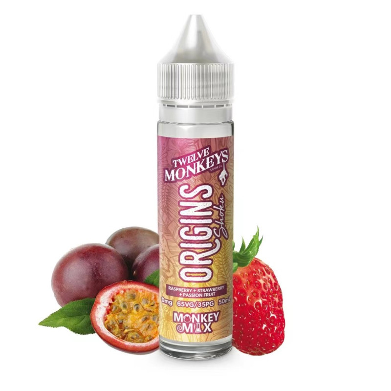 SHOKU 50ML - 12 Monkeys Origins propose un mélange fruité associant fraise, fruit de la passion et framboise avec un ratio PG/VG de 35/65, favorisant une vapeur dense et une bonne restitution des arômes. Sans nicotine, ce e-liquide est conditionné dans un flacon PET de 60 ml avec bouchon twist et sécurité enfant. Fabriqué au Canada, il répond à des normes strictes de qualité. Adapté aux clearomiseurs sub-ohm, ce produit offre une option fruitée fiable et sécurisée.